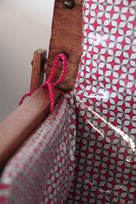 Chaise récupérée au fond du grenier de ma grand-mère, peinture rouge de chez Castorama, Tissu enduit Echino cerf à lunettes de chez Motif Personnel.