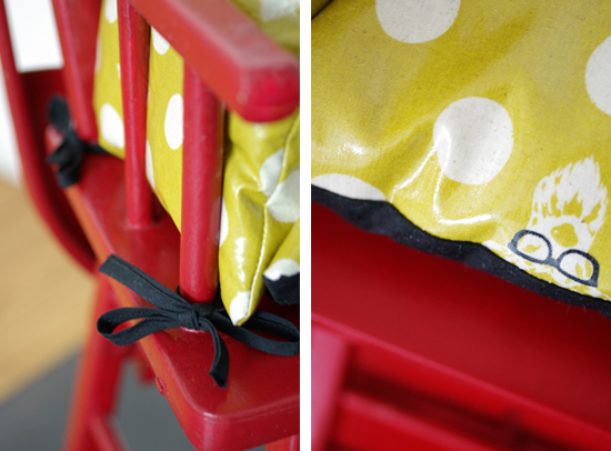J’ai d’abord passé un peu (beaucoup) de temps à laver, poncer, décaper cette vieille chaise d’un rose douteux ! puis une fois repeinte en rouge je me suis lancée dans la confection d’un coussin. J’ai utilisé ce tuto que j’ai adapté aux dimensions de ma chaise haute dégotée au fond du grenier de ma grand-mère, le résultat, un coussin douillet à souhait pour les petites fesses d’Abel, qui semble ravi ! (Cyrielle)