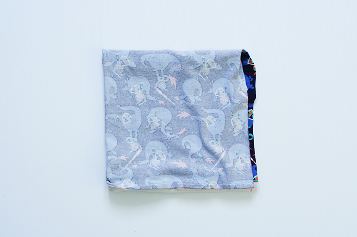 Cousez le long des deux grands côtés en laissant une ouverture d’environ 5 cm sur un des côtés. Coudre avec un point élastique (point spécial de votre machine ou tout simplement un point zig zag). Les snoods vont être enfilés plusieurs fois par jours, une couture élastique sera plus résistante.