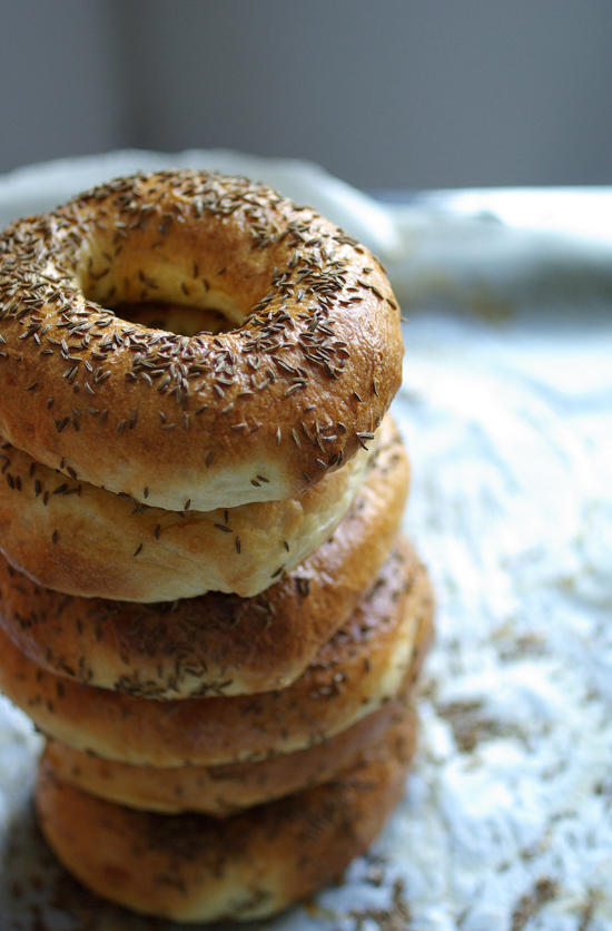 Pour 6 bagels : 450g de farine T65, 10g de levure biologique, 9g de sel, 230g d’eau, 30g de sucre, 18g d’huile d’olive, graines de carvi, de sésame, de pavot. Pochage : 3l d’eau, 20g de fécule de pomme de terre, 20g de cassonade, 40g de sel.