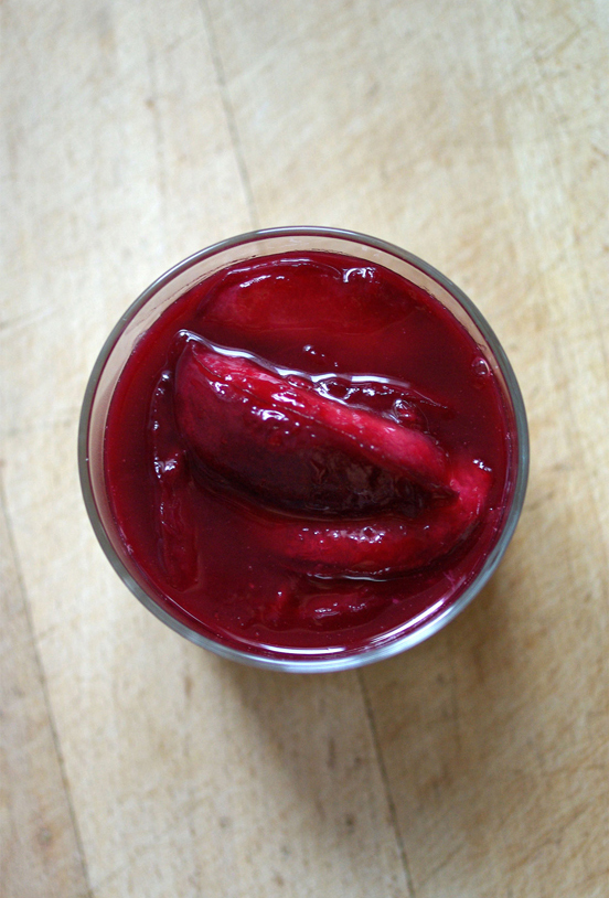 Pendant ce temps là… Laver et couper les pêches en 8. Mettre du sucre (la quantité de sucre c’est suivant votre goût et suivant la maturité des fruits) dans le fond d’une poêle pour faire un caramel, y mettre les pêches et remuer pour enrober les fruits de caramel.